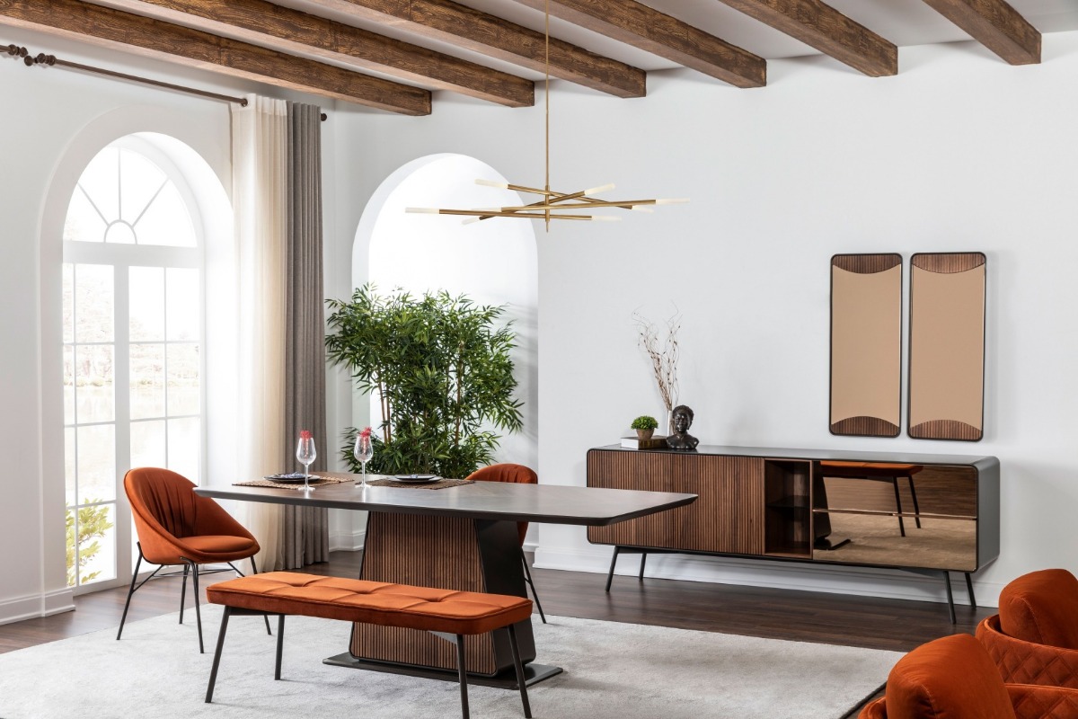 Yeterince alanınız varsa ve bu alan size, seçeceğin masa formu ile ilgili özgürlük tanıyorsa, cesur seçimler yaparak sıra dışı bir yemek alanı oluşturabilirsiniz. Farklı ve özgün bir yemek masası için ahşap ve gold tasarım ayakları olan Harmony yemek odası takımını tercih edebilirsiniz.